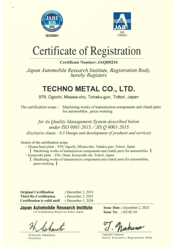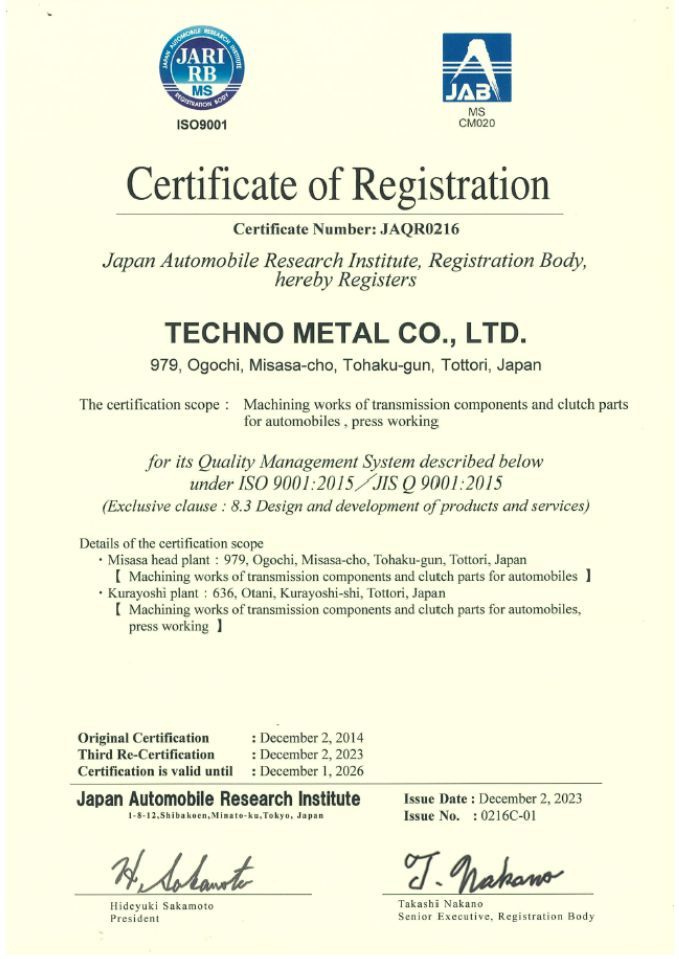 株式会社テクノメタルは、お客様に満足して頂くとともに社員ならびにお取引先様との信頼関係を確立していくことを目的として品質マネジメントシステムの継続的な改善活動を行います。